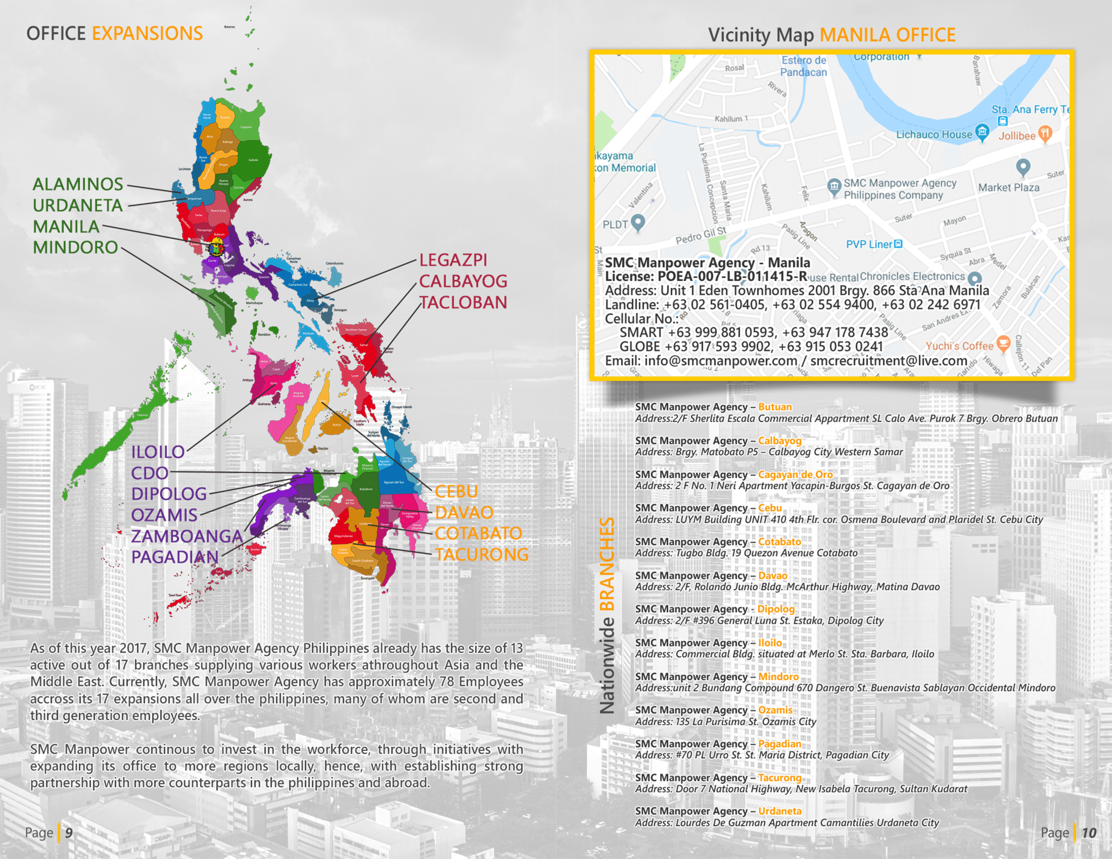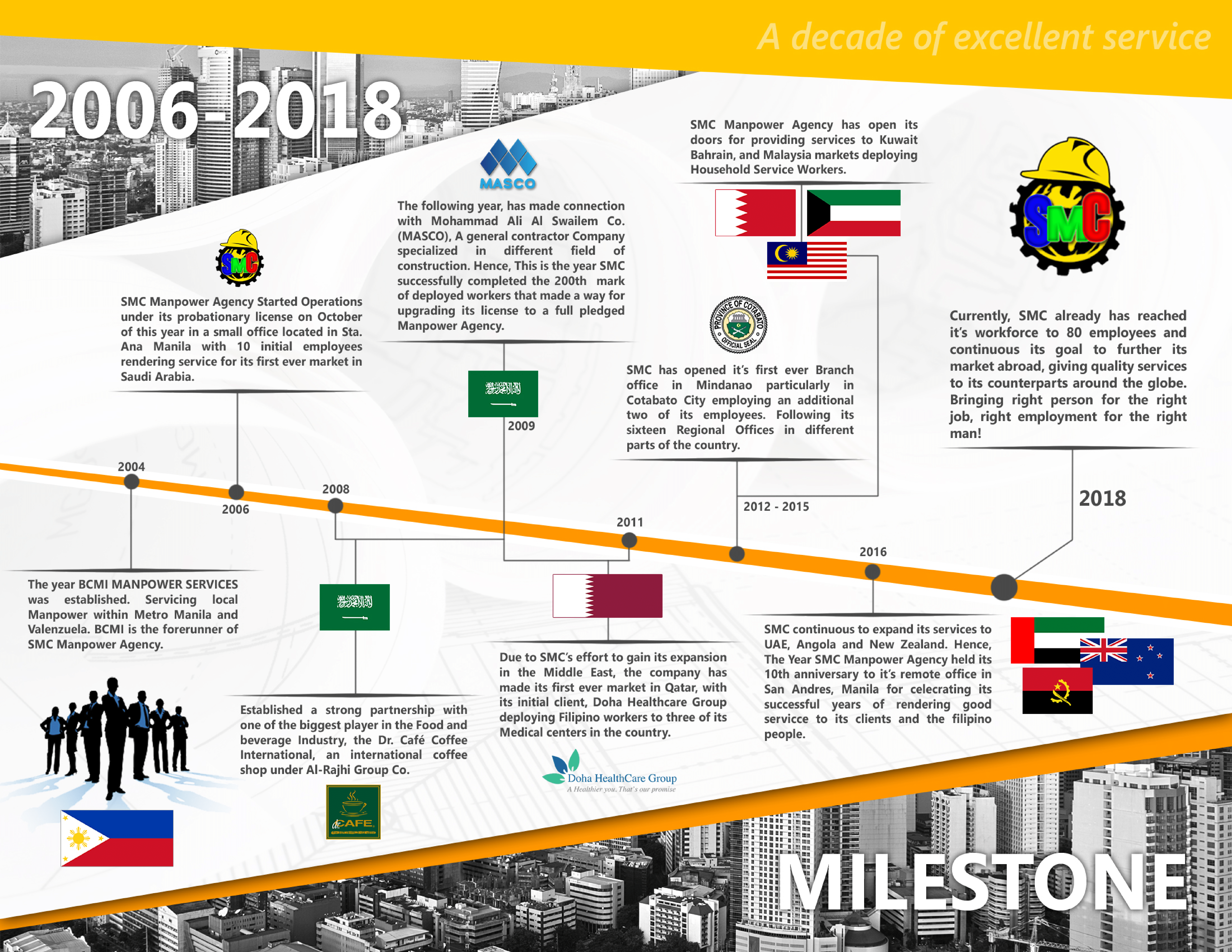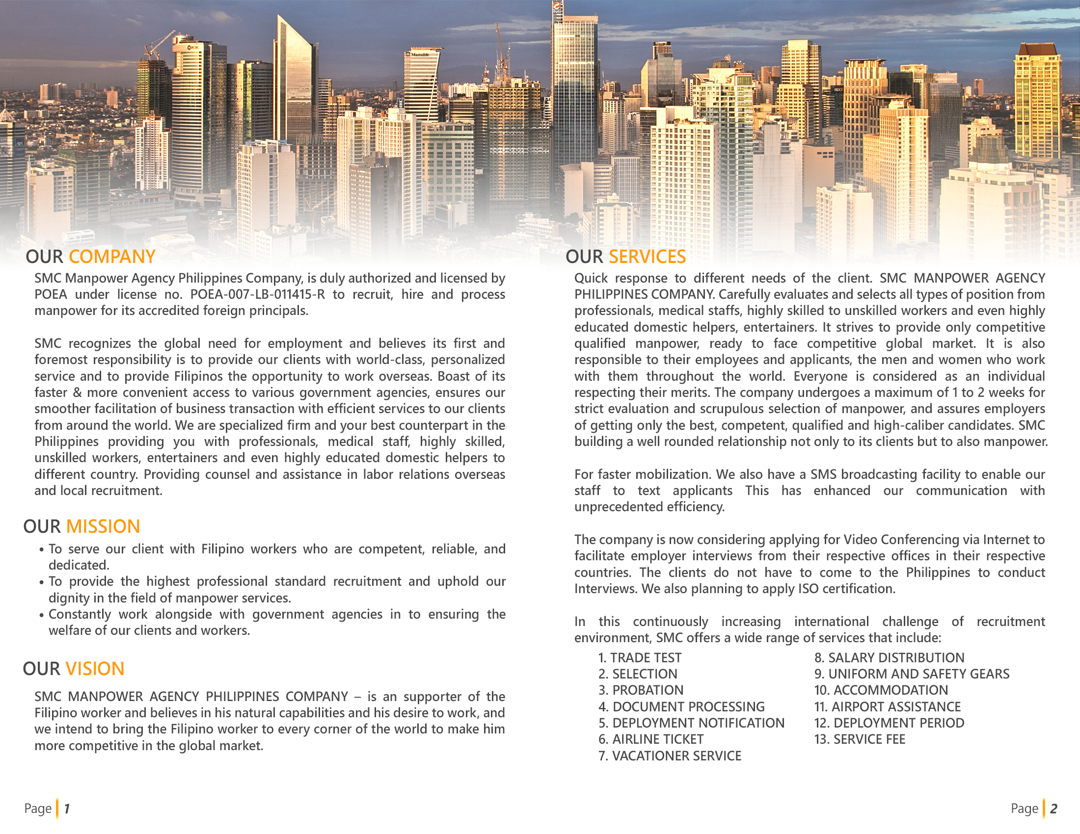 SMC recognizes the global need for employment and believes its first and foremost responsibility is to provide our clients with word-class, personalized service and to provide, Filipinos the opportunity to work overseas. Boast of its faster & more convenient access to various government agencies, ensures our smoother facilitation of business transaction with efficient services to our clients from around the world.
